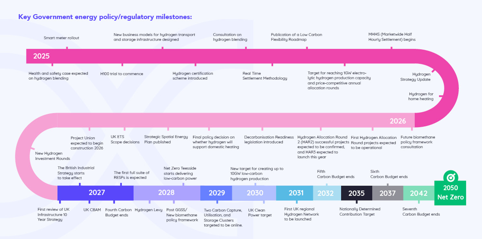 Key Government energy policy/regulatory milestones from 2025 until the net zero deadline of 2050.