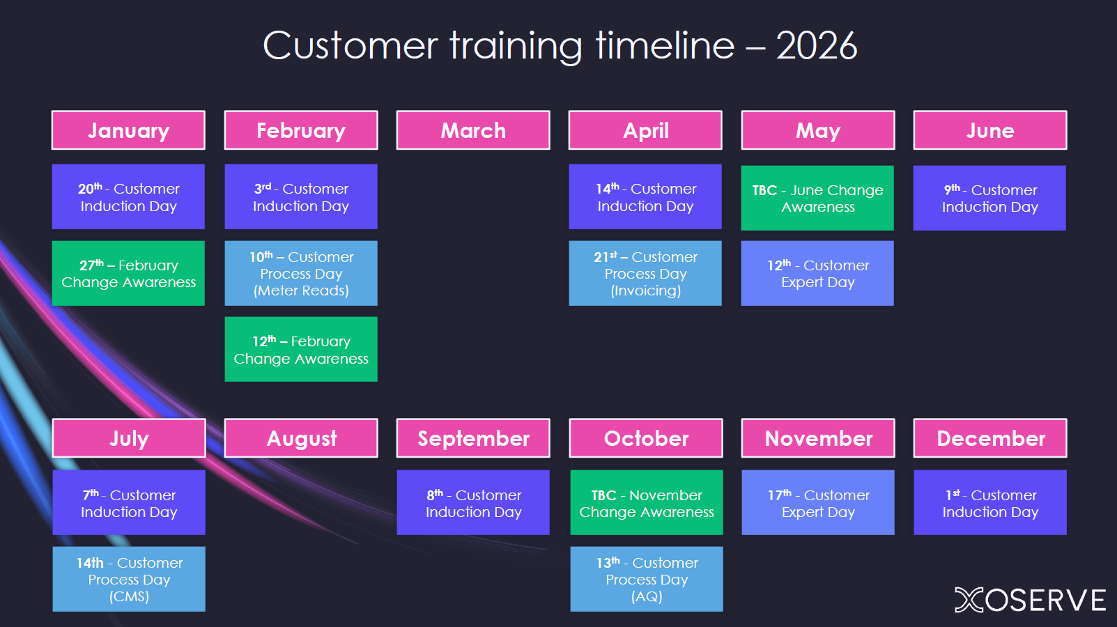 2026 Customer training calendarA high level view of our scheduled 2026 customer days, all on one page.